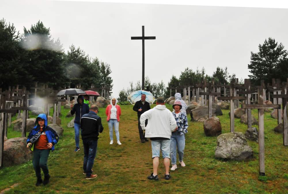 Drugi dzień rozpoczęliśmy mszą świętą w pobliskim kościele, a następnie po śniadaniu opuściliśmy hotel. Kilkakrotnie objechaliśmy rondo, na którym znajduje się Pomnik Obławy Augustowskiej. Terminem Obława Augustowska określana jest sowiecka operacja wojskowa z lipca 1945 roku. Była to największa zbrodnia popełniona na Polakach po II wojnie światowej. Co najmniej 600 Polaków zostało zamordowanych w nieznanym miejscu , a sprawcy pozostali bezkarni.